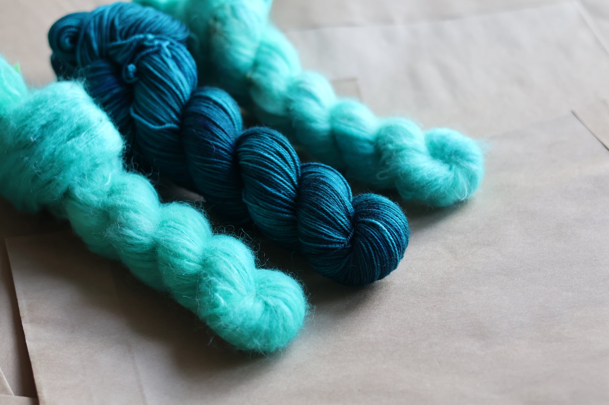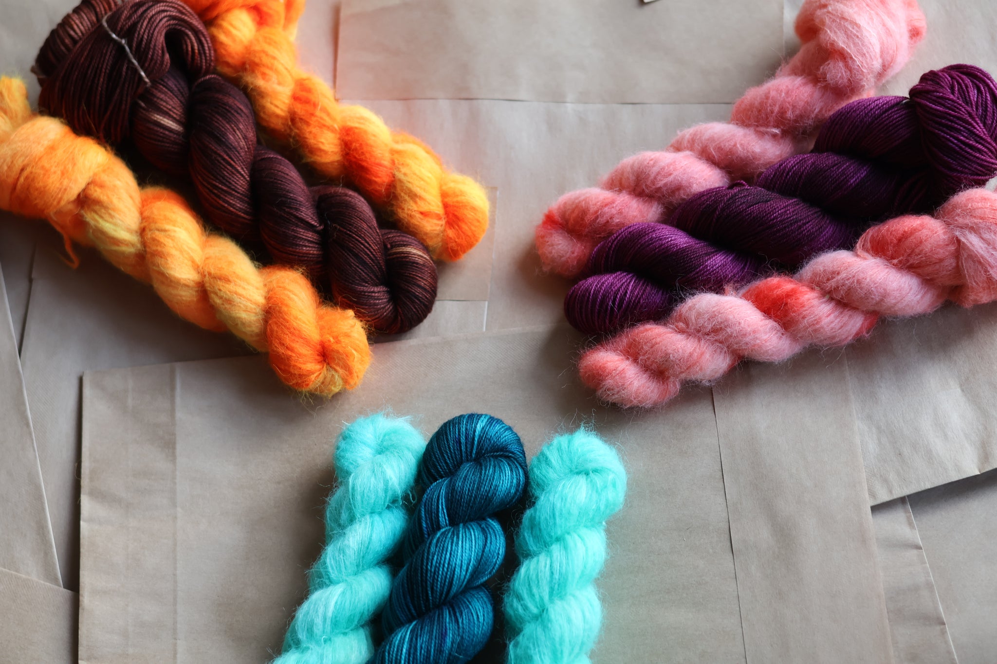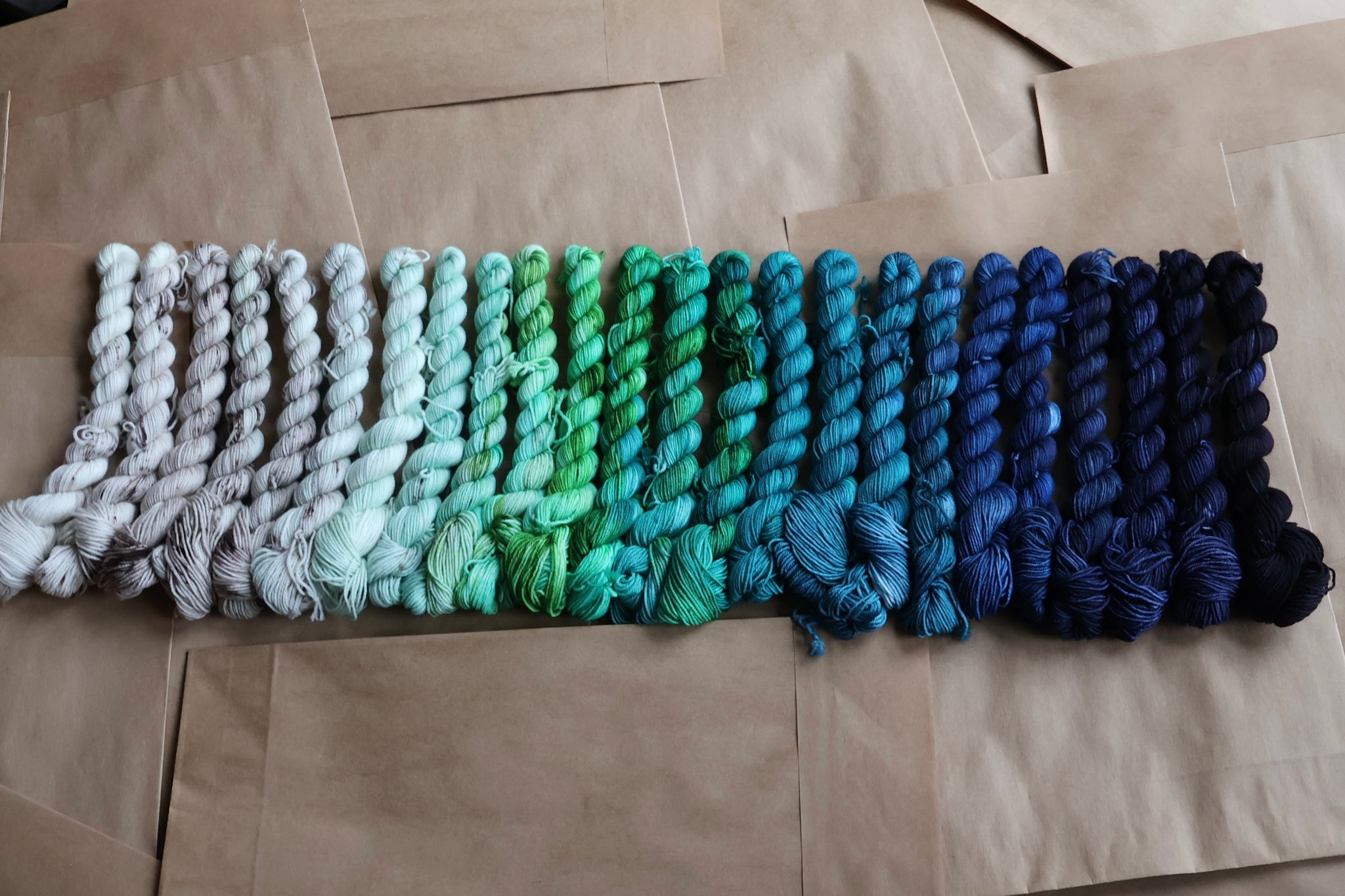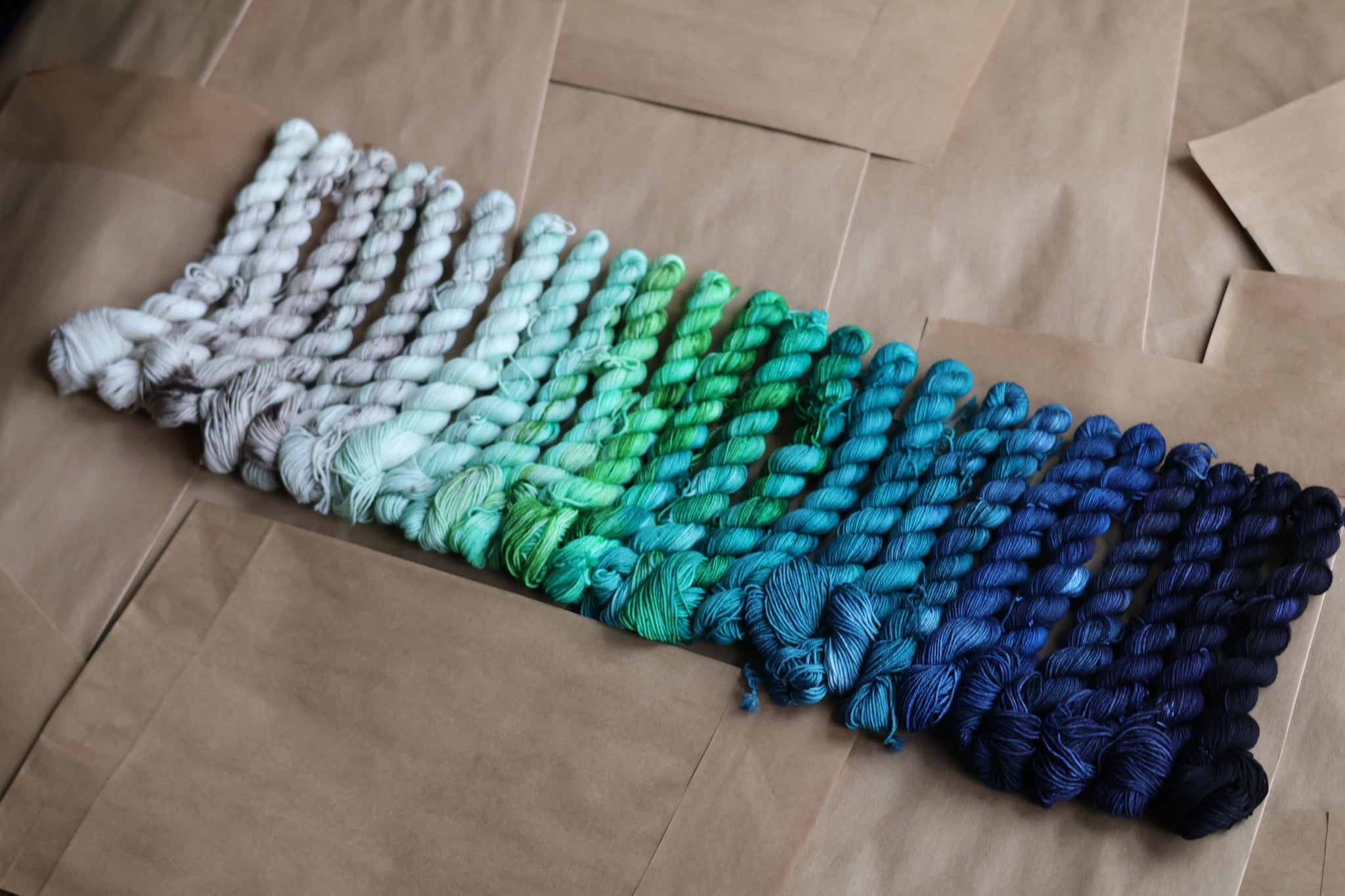 Taking inspiration from everything I’ve learned in the last five years of dyeing yarn and creating new colourways, I am creating mini skein sets of ten colourways moving through the colours within a rainbow.